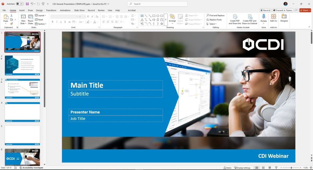 When joining CDI their presentations and branding was inconsistent. The slides featured a mix of outdated infographics, unbranded content, and varying design styles. I took the initiative to remove all outdated slides and developed a cohesive, newly designed slide deck template, which I then distributed across all departments to ensure a unified and professional presentation style.